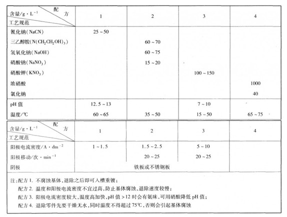 在鍍銅錫合金過程出現的不合格鍍層,退除方法見表4-1-7。